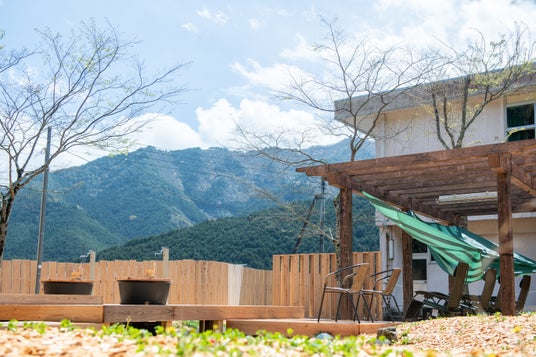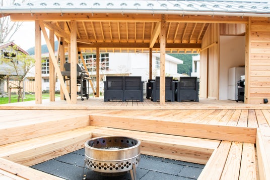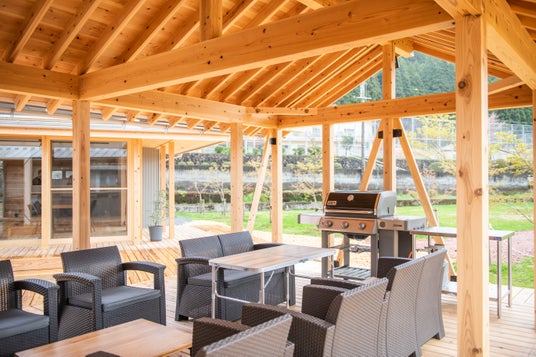 防炎処理を施したウッドデッキで楽しむ、焚き火とBBQ。里山の風景を眺めながら、自然の光や風を感じられるくつろぎスポットで、贅沢なひとときをお楽しみいただけます。