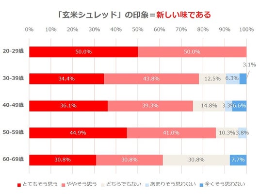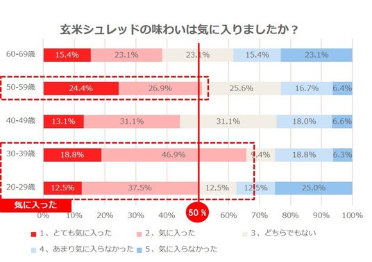 米シュレッドの味わいについて、全体では50%が「気に入った」と回答。