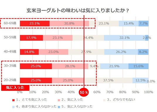 玄米ヨーグルトの味わいについて、全体では44%が「気に入った」と回答。