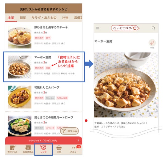 新機能は、リストに残る食材を活用したレシピを表示します。これまで単品の食材別に提案していたレシピを利用者の注文商品に合わせて複数組み合わせ、リスト化します。調理の方法や時間で絞り込みができ、主菜や副菜、汁物など利用のタイミングや好みに合わせて選べます。