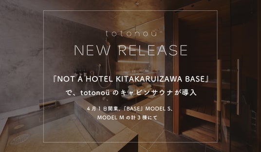 totonou Japan株式会社(本社:東京都渋谷区、代表:齋藤アレックス剛太、以下「totonou(ととのう)」)は、NOT A HOTEL株式会社(本社:東京都渋谷区、代表取締役CEO:濱渦伸次、以下「NOT A HOTEL」)が4月1日(月)に開業した物件『NOT A HOTEL KITAKARUIZAWA BASE』にて、北欧産のキャビンサウナ製品『Auroom Cala Mini(オールーム カラ ミニ)』が導入されたことを発表します。