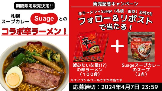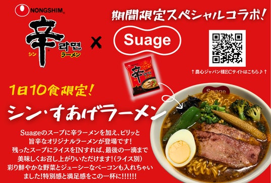 株式会社農心ジャパン(本社:東京都千代田区、代表取締役社長:金大廈)は、2024年4月1日(月)より、北海道スープカレー「Suage(すあげ)」の国内9店舗で、コラボレーションメニュー「シン・すあげラーメン」を期間・数量限定で販売します。また、発売を記念して、辛ラーメン・Suage公式Xでは、辛ラーメン・Suageスープカレーのスープが抽選で10名様に当たるキャンペーンを実施します!