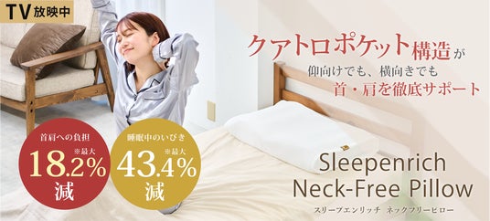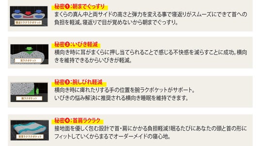 特許技術使用の「クアトロポケット構造」が肩首の負担18.2%減、いびきの量43.4%減を実現 ※製造特許番号:5796263