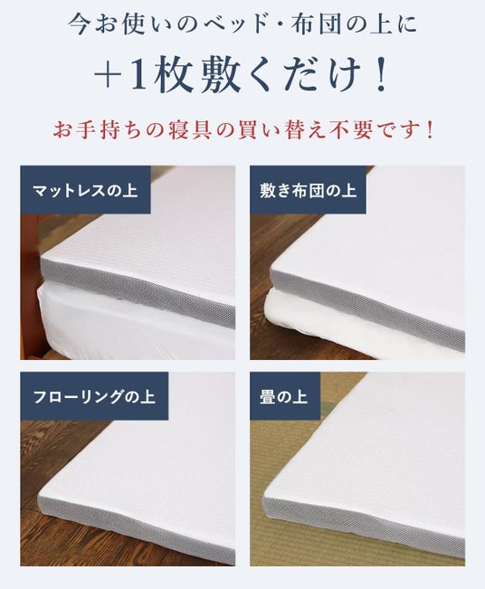 どんな睡眠環境でも対応今お使いのベッド・寝具の上に敷くだけなのはもちろん、フローリングや畳の上に直接敷いてもご利用いただけます。