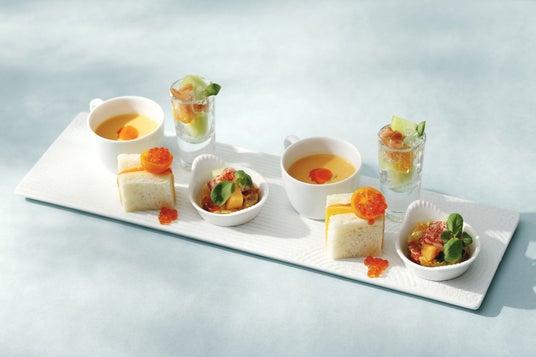都会の中でも自然豊かな御殿山で、四季の移ろいを感じながらお楽しみいただく東京マリオットホテルのアフタヌーンティー。5月から6月は昨年もご好評いただいた「千葉アクアメロン」が主役のアフタヌーンティーに、オレンジ色がかわいらしい高知県産の上質な赤肉メロン「アールスヴェロッサ」が加わり新たにリニューアル。それぞれ14度以上の高い糖度にきめ細やかな果肉の舌触りと柔らかさを誇る、2つのメロンの贅沢な味わいを存分に堪能するスイーツ・セイボリーがテーブルに並びます。スイーツはフレッシュな2種のメロンを贅沢に使用したスムージー仕立てのパフェやタルト、シュークリームなど8品をご用意。メロンのみずみずしさやライトグリーン・オレンジが目を惹くビジュアルからも初夏の爽やかさを感じられるラインアップです。セイボリーは、甘みと塩味が絶妙な生ハムメロンや「アールスヴェロッサ」を添えた海老のビスクなど4品が並びます。