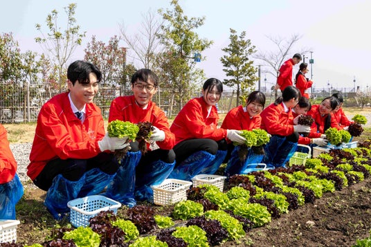 式典の後、新入社員は畑で“未来への種まき”としてゴマの種をまき、食べ頃に育ったジャムレタスを収穫しました。