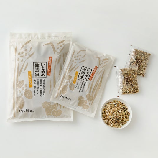 「いもやの雑穀米」は、芋が主役のブレンドです。雑穀米のエキスパートが十六種類の雑穀米の特長や穀物同士の相性などを考えながら外皮をはずしたり、残したり、発芽させたり、砕いたりと小さな一粒一粒までいろんな知識と技術を生かして細やかにブレンドしてくれました。