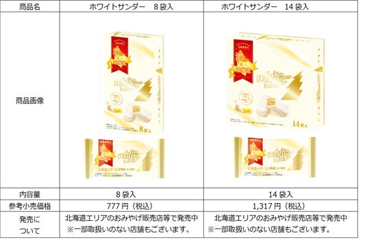 ホワイトサンダーは白いブラックサンダーの10周年を記念して2021年9月に発売いたしました。配りやすいおみやげとしてご愛顧頂いております「白いブラックサンダー」に対して、北海道ならではの特別感や限定感をさらに感じられる「贈りたくなるおみやげ商品」をテーマに商品開発いたしました。北海道ミルクや北海道発酵バターを使用し「北海道の濃さ」をぎゅっと凝縮しつつも、上品なおいしさを味わえる商品となっております。贈りたい人数にあわせて選べる2サイズを発売しております。発売後から「北海道の濃さに恋」してしまう方続出!?新しい北海道みやげとして多くのお客様にお楽しみ頂いております。◆商品概要
