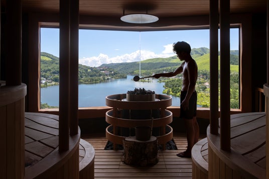「湖畔混浴 空」の展望サウナには、湖に向けてせり出した大きな窓が立体的に設置され、車山から白樺湖までの風景を大きく切り取ります。