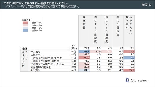 インパクトホールディングス株式会社の完全子会社で、マーケティングリサーチ事業を展開する株式会社RJCリサーチ (本社:東京都渋谷区、代表取締役社長:野口 将和、以下 「RJCリサーチ」 ) は、お仕事紹介サイト 「MediF」 に登録しているスタッフ、全国のメディアクルー354人 (20歳~69歳男女) に対して 「朝ごはんに関する調査」 を実施いたしました。 新年度になり、生活が変化する人も多い時期となります。一日の始まりである 「朝ごはん」 の現状について聴取いたしました。