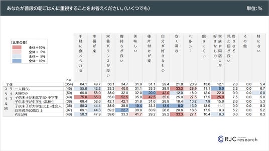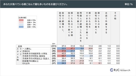 ● 「自分で調理をし、自宅で食べる」 割合が特に高いのは、「夫婦のみ」 と 「子供末子が中学生・高校生」 の世帯であった。上記 〈朝ごはんに重視すること〉 の回答も鑑みると、夫婦のみの世帯は 「自分が好きなもの」 を重視している傾向がみられる。