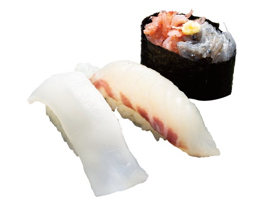 春三昧第二弾(あおりいか/アセロラ真鯛/生しらす生桜えび合盛り軍艦)590円