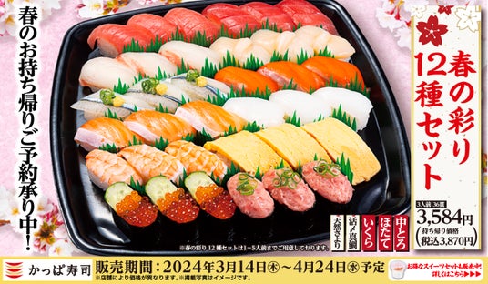 春は、感謝や祝福、激励、歓迎などの気持ちを届けるさまざまな行事が目白押しです。ご家族やご友人、大切な方たちと囲む春の食卓にかっぱ寿司の期間限定お持ち帰りセット『春の彩り12種セット』で、春のひと時をお過ごしください。