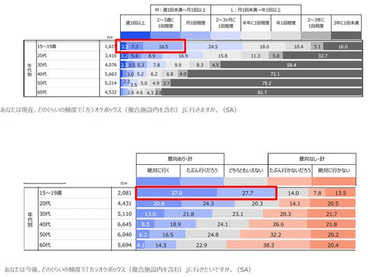 「現在のカラオケボックス利用頻度」、「今後の利用意向」ともに「10代」が1位となりました。