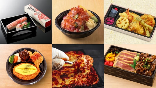 (上段左)「紅ずわい小袖」(税込1350円)/北陸お弁当フェア、(上段中)「頂 いただき丼」(税込1980円)/海鮮丼 大江戸、(上段右)「東京駅限定 みやび天重」(税込1296円)/神田明神下 みやび、(下段左)「銀座ライオンプレート」(税込1680円)/銀座ライオン、(下段中)「生パスタの和牛ミートラザニア」(100gあたり税込700円 ※200gからの販売)/トウキョーラザニア by チル、(下段右)「牛カツ・黒毛和牛カルビミックス弁当」(税込1782円)/黒毛家