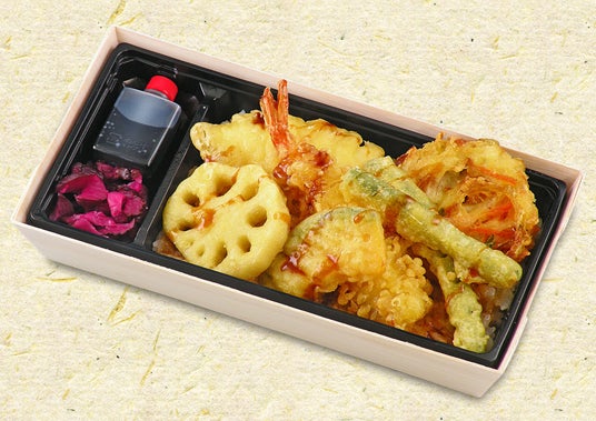東京駅限定 みやび天重「東京駅限定 みやび天重」(税込1296円)海老・蓮根・南瓜・いか・いんげん・野菜天と人気の天婦羅を詰め合わせたエキュート東京限定の天重です。店内厨房で作る「神田明神下 みやび」自慢の天婦羅を出来たてでご堪能いただけます。