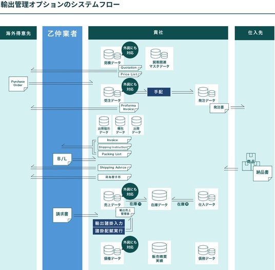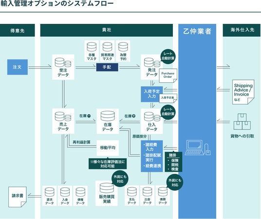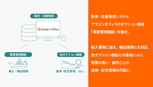こうした動向を受け、販売・在庫管理システム「アラジンオフィス」のオプション機能「貿易(輸入・輸出)管理機能」を強化しました。これまで提供してきた輸入管理機能に加え、輸出管理機能も搭載しています。各商品の原価・利益や、納期の正確な管理が可能になり、国内外取引の管理が1つのシステムで完結できます。