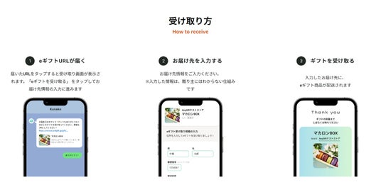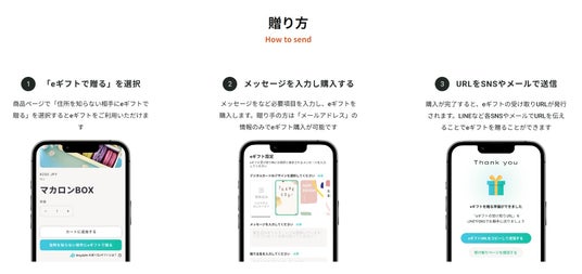 「eギフト」とは、ギフトを贈りたいお相手の住所や本名を知らなくても、LINEやメール・SNSで受け取り専用URLを渡すだけで手軽にギフトが贈れるサービスとなります。