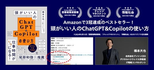 生成AI本で圧倒的に売れている「頭がいい人のChatGPT&Copilotの使い方」は合同会社ブンシンCEO橋本大也の最新書籍です。この書籍は、「そもそも生成AIって?」レベルの初心者から、どこまで活用できるかを見極めたいエンジニアまでに対応でき、明快なプロンプトを真似するだけで活用方法がわかる、非常に守備範囲の広い内容となっています。
