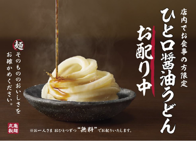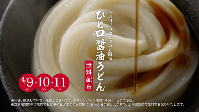 日本全国のすべての店への麺職人配置完了を記念し、職人たちが打つ麺そのもののおいしさをより多くの方に実感いただきたいという想いから、この度初めて全国の丸亀製麺にて「ひと口醤油うどん」を2024年4月9日(火)から11日(木)までの3日間限定で実施いたします。店内でお食事の方全員にお一人様おひとつ無料でご提供いたします。