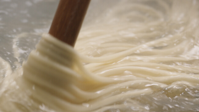 この厳しい試験を合格した麺職人たちは、安定したおいしさ以上の「最高の一杯」をお届けするために、日々技と感性を磨きながら粉からうどんを打ち、手づくり・できたてのうどんを提供しています。