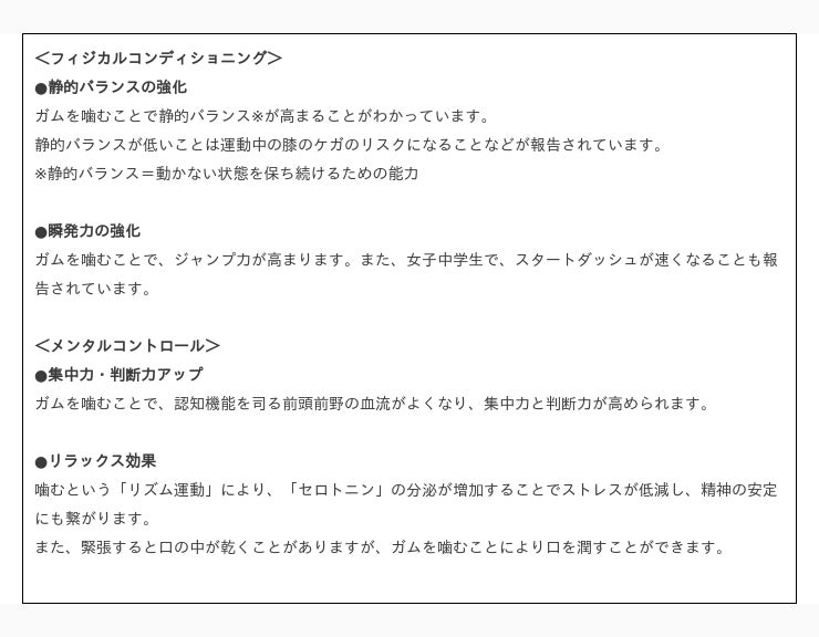 サッカー選手が何故ガムを噛んでいるのかと気になっていたのですが「噛むこと」の様々なメリットが分かり自分も取り入れていきたいです。
