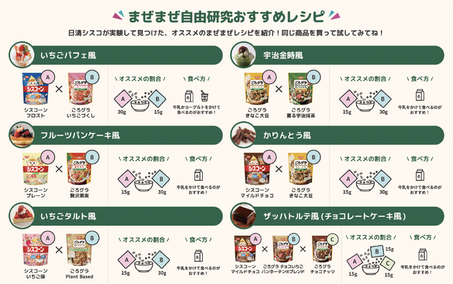また、開発したレシピは「まぜまぜ研究証明書」に記載し、レシピを記録することもできますので、この機会にバリエーション豊富な「ごろグラ」と「シスコーン」をまぜまぜして、あなただけのオリジナルレシピを発見してみてはいかがでしょうか。