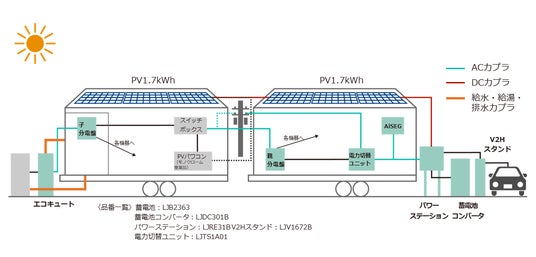 プライム ライフ テクノロジーズ社は、人と社会をつなぐコネクテッドシティを目指す中、系統電力から自立した施設として薄膜軽量のPVシステムを搭載したミサワユニットモビリティ「ムーブコア」にパナソニック製V2Hシステム(蓄電池6.3kWh、V2H スタンド、HEMS)を設置し、トヨタ自動車製の電気自動車(BEV)も活用し、電力のコントロールを行います。同施設での季節ごとのエネルギーデータ計測を行うことで、暮らしに関わる様々なパターンを探り、宿泊施設等のユニットモビリティの開発につなげる予定です。