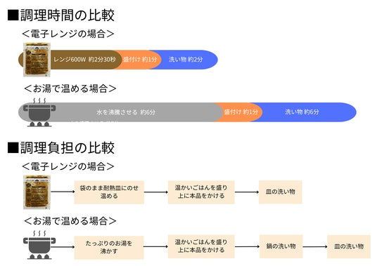 鍋を使用して調理する場合、本品を湯煎するためのお湯沸かしから鍋を洗う工程まで約13分かかります (当社調べ)。本シリーズは約5分半の調理時間(レンジ加熱)で完成するので、調理・後片づけの時間短縮に加え、レンジ調理中もキッチンで待機する必要がほとんどなく、優れたタイムパフォーマンスで時間を有効活用することができます。