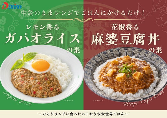 株式会社 大光食品(本社:長崎県島原市、代表取締役:山中数浩、以下「当社」)は、電子レンジで中袋のままチンして、ごはん1人前(150g)にかけるだけで食べられる「レモン香るガパオライスの素/花椒香る麻婆豆腐丼の素」を2024年4月2日(火)より発売いたします。冷凍食品だからこそ、出来立ての豊かな風味を実現できました。