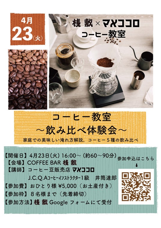 カフェバーとしての営業だけでなく、アーティストとのコラボ企画として展示やワークショップ開催などのイベントを重ねてきた中、記念すべき1周年の4月は桟敷の魂とも言える”コーヒー”にフォーカスを当て、飲み比べ体験教室を開催いたします。