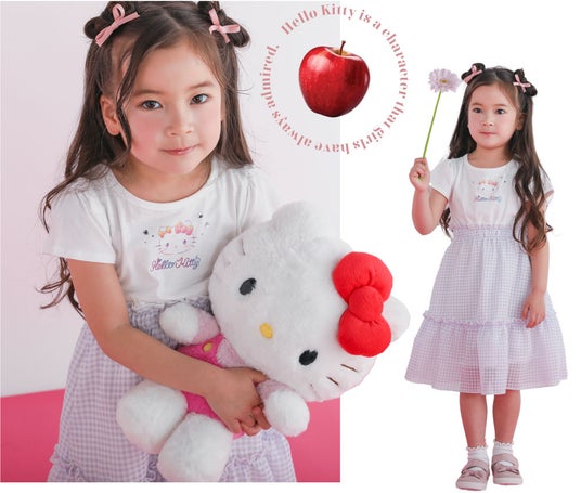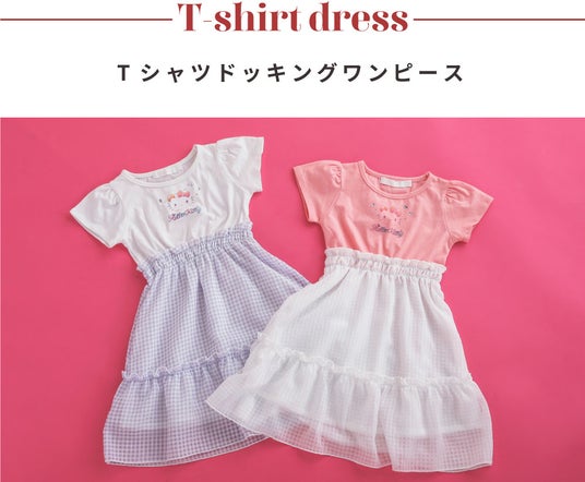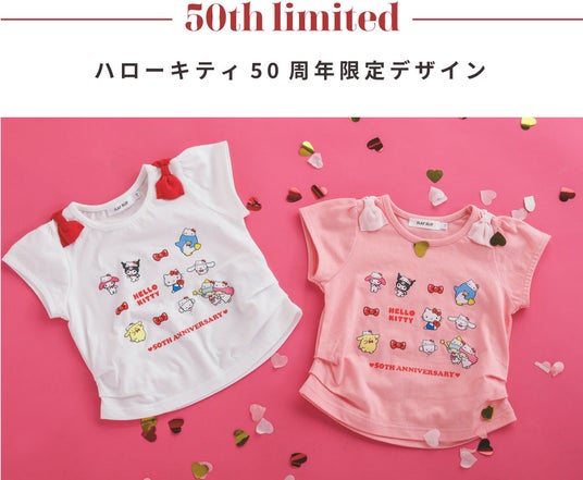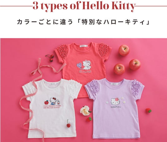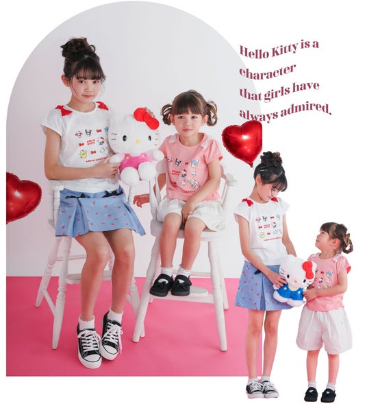 ハローキティ50周年の特別なデザインや、平成ギャルテイストのデザインなど、様々なハローキティデザインが登場します!女の子がときめく、ふんわりと広がるフレアスカートワンピースや袖にフリルが付いたパフスリーブTシャツなど、きっとお気に入りのお洋服が見つかるはずです!大好きなハローキティと一緒に春夏のお出かけを楽しんでください!