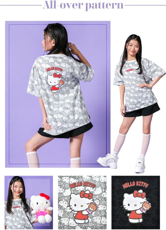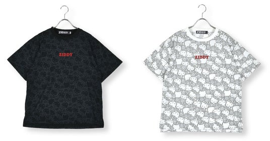 ハローキティがいっぱいな総柄プリントのTシャツはインパクト大でカワイイアイテム!モノトーンベースだから実はいろんなアイテムと合わせられる優れもの☆ 【ハローキティ×ZIDDY】総柄ビックTシャツ¥3,960円(税込) 展開サイズ:130~160cm