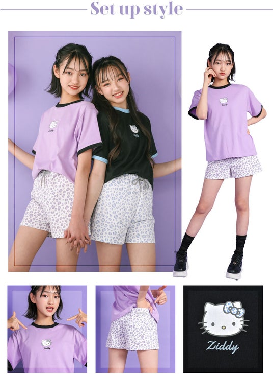 ギャル感、強めなヒョウ柄のショーンパン&胸元のハローキティがポイントのアイテム!セットアップだから他のアイテムと合わせていろいろなコーデを楽しめます!ヒョウ柄はよく見るとハローキティのリボンが☆ 【ハローキティ×ZIDDY】Tシャツ&ショートパンツセットアップ¥5,390円(税込) 展開サイズ:130~160cm