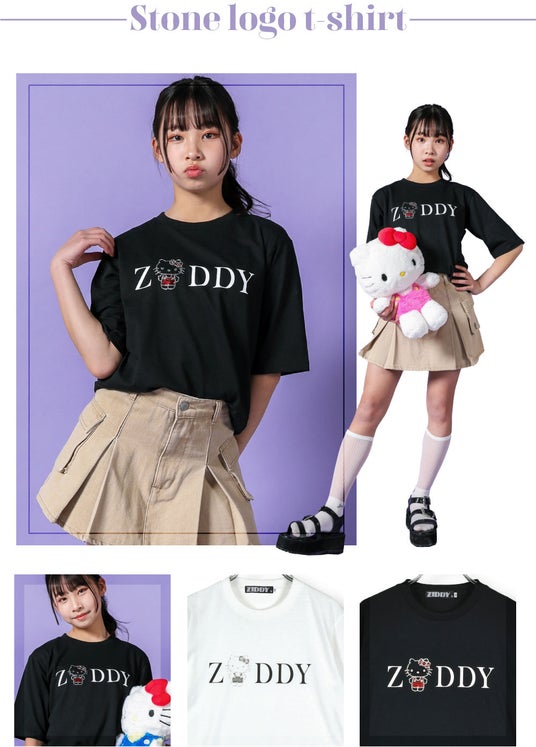 モノトーンのTシャツにキラキララインストーンのハローキティが映えるアイテム。シンプルだからどんなアイテムにも合わせやすい!ZIDDY(ジディー)の「I(アイ)」がハローキティになってるのが1番のポイント!【ハローキティ×ZIDDY】ラインストーンロゴTシャツ ¥3,190円(税込) 展開サイズ:130~160cm