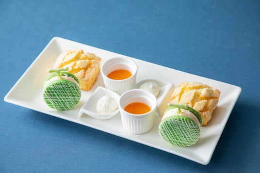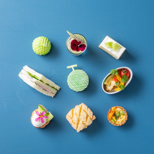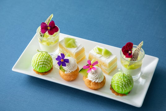 シェフパティシエ 貝塚 文浩(かいづか ふみひろ)が丁寧かつ遊び心を入れて作り上げたグリーンカラーがまぶしい本年のメロンアフタヌーンティーは、メロンとマスカットのジュレを合わせた清涼感が楽しめる杏仁や、鮮やかなオレンジ色の果肉が特徴の赤肉メロンをイメージしたムース、昨年ご好評いただいた“スコーンのメロンパン仕立て”などスイーツ全6品、メロンとハムのサンドウィッチなど全3品のセイボリーと見た目も味わいも多彩です。
