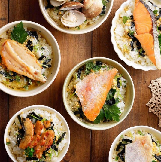 具材の種類は全20種類:金目鯛茶漬け、まぐろ茶漬け、鰻茶漬け、鮭茶漬け、いわしの塩焼茶漬け、磯海苔茶漬け、焼海老茶漬け、鮎茶漬け、鱈子茶漬け、梅茶漬け、蟹茶漬け、厚切り牛タン茶漬け、穴子茶漬け、蛤茶漬け、煮たまご茶漬け、炙り明太子茶漬け、炙り鯛茶漬け、金華鯖茶漬け、牡蠣茶漬け、桜海老茶漬け