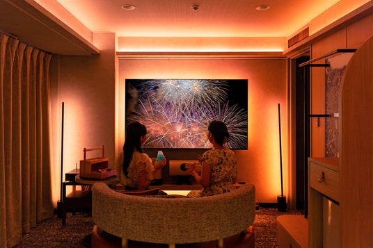 新宿プリンスホテルは2024年4月に「シアタールーム」を新設いたしました。室内には75インチのスマートテレビや5.1chサラウンドスピーカー、映像に合わせて色が変化する照明器具などの設備が充実。プラン限定でお貸し出しする花火大会映像をスマートテレビで流すと、ダイナミックな花火の映像と連動し照明がカラフルに照らし出され、より没入感を演出します。