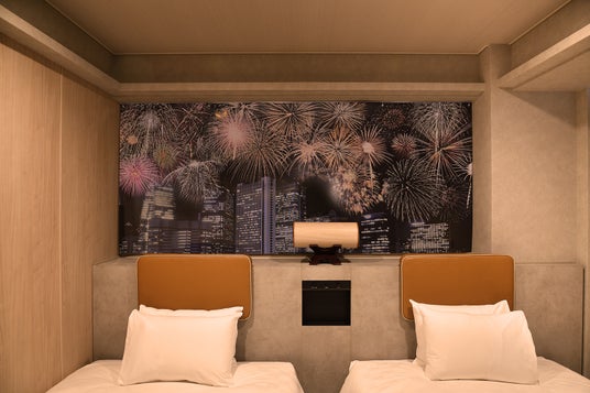また、スマートフォンなどのカメラでフラッシュライトを使用し撮影を行うと、肉眼では見えないビジュアルが写真に写り込む 「リフレクト印刷」 を活用した客室装飾を設置。西新宿の夜空一面にダイナミックな花火が写り込む、撮った人にしか分からない驚きの写真体験をお楽しみいただけます。