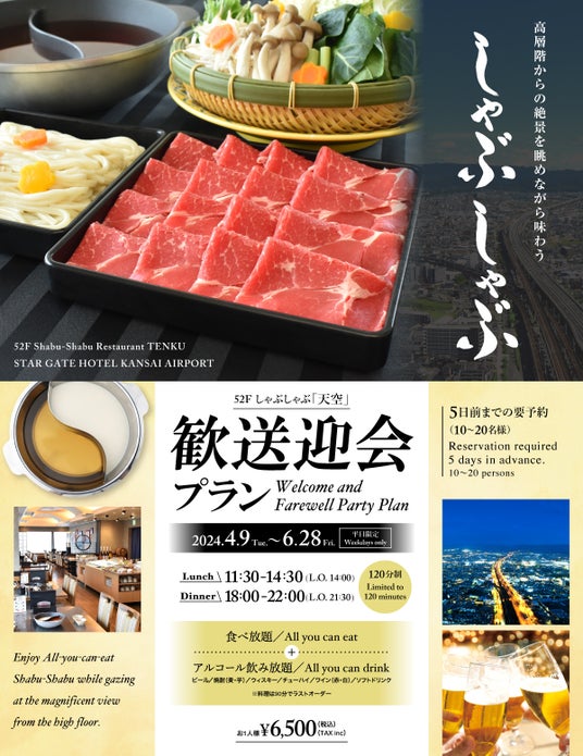 関西国際空港の対岸にある地上256mの超高層ランドマークタワー、スターゲイトホテル関西エアポート(所在地:大阪府泉佐野市りんくう往来北1番地)は、52階の高層階レストラン しゃぶしゃぶ「天空」にて、平日はしゃぶしゃぶ食べ放題とアルコール飲み放題が各500円引きとなるお得なキャンペーンを期間限定で実施中。お好みで選んだ新鮮な食材を、特製の出汁でお楽しみいただけます。4月からは同料金でソフトドリンク飲み放題付と、食べ放題にたこ焼きとラーメンが追加されました。この機会に高層階からの景色を眺めながら特別なメニューをお得にお愉しみください。