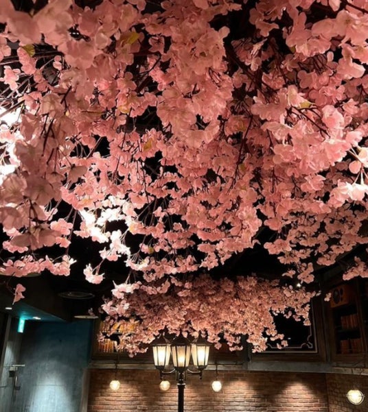 2本の桜の木が天井を覆い尽くすように広がり、灯りが照らす空間は、まるで外で桜を観ているような心地良い感覚に包まれます。