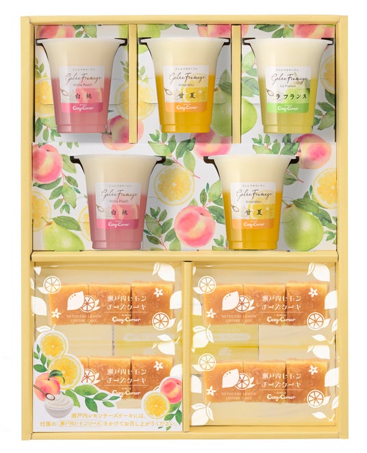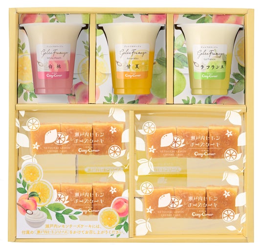 ジュレフロマージュ(白桃、甘夏、ラ フランス)各1個、瀬戸内レモンチーズケーキ(瀬戸内レモンソース付き)3粒入×4個