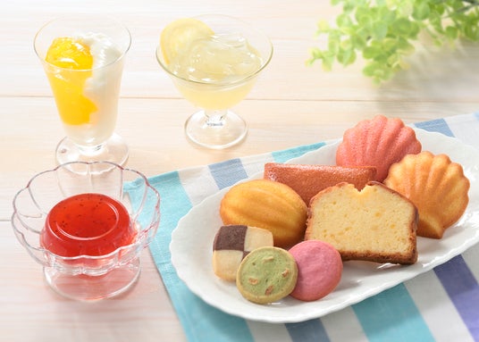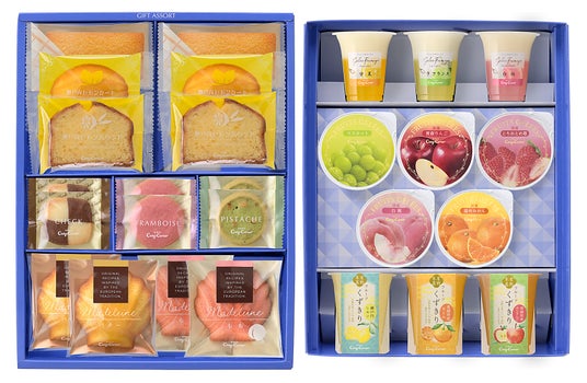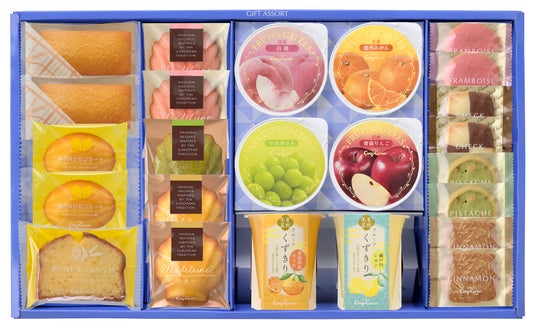 フリュイジュレ(とちおとめ苺、白桃、温州みかん、青森りんご、マスカット)各1個、フルーツくずきり(瀬戸内レモン、青森県産ふじりんご、愛媛県産せとか)各1個、ジュレフロマージュ(白桃、甘夏、ラ フランス)各1個、フィナンシェ、瀬戸内レモンケーキ、瀬戸内レモンパウンド 各2個、マドレーヌ(バター、もも)各2個、クッキー(ピスターチ、チェック、フランボワーズ)各2個