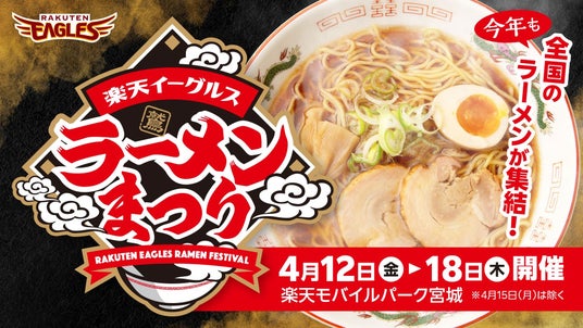 株式会社楽天野球団(本社:宮城県仙台市宮城野区、代表取締役社長:森井 誠之)は、楽天イーグルス ラーメンまつりを4月12日(金)から4月18日(木)の6日間(※15日を除く)限定で、楽天モバイルパーク宮城 正面広場にて開催することとなりましたので、お知らせいたします。今年のラーメンまつりでは、県内外から8店舗が出店し、各店を代表する個性溢れるラーメンを提供します。会場は楽天モバイルパーク宮城の入場エントランス手前にある正面広場です。この機会にぜひお気軽に楽天イーグルスのラーメンまつりへお越しください!