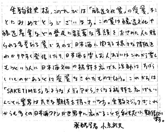 「 生駒龍史様、このたびは「醸造文化賞」の受賞、まことにおめでとうございます。この賞は醸造文化や醸造産業などの普及に顕著な業績をおさめた人に贈られる名誉ある賞ですので、日本酒に関する様々な情報をわかりやすく発信したり、日本酒を楽しむ人、あるいはこれから楽しもうという人に日本酒文化の裾野を広げた活動はすばらしいものがあるとして受賞なされたものでしょう。これからは「SAKETIMES」のようなメディアから、さらなる裾野を広げていくことに業界は大きな期待を持っています。生駒マジックで、これからも多くの日本酒ファンが世界中に広がることを、私も大いに期待しています」