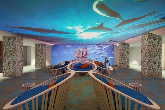 青い天井に映し出される魚が、まるで海の中にいる気分にさせてくれる、小さなお子様にも楽しんでいただける空間です。