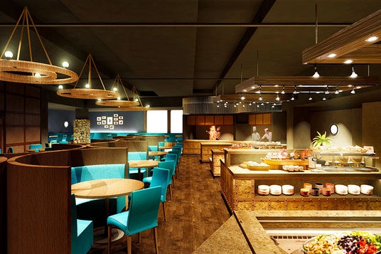 海側のエリアは、大きく海への開いた船のデッキをイメージした空間に、ライブキッチンやブッフェボードが並ぶエリアは豪華客船のダイニングをイメージした空間へと生まれ変わります。