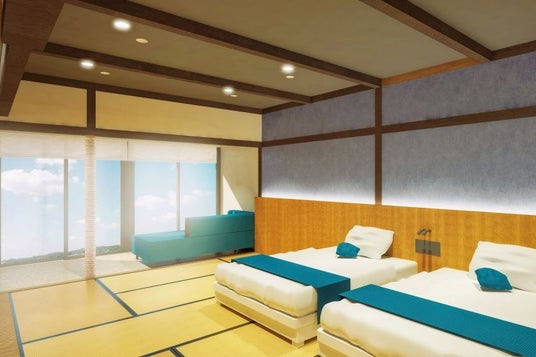 オーシャンビューの客室を、海の青さや砂浜をイメージさせる和モダンルームにリノベーションいたします。