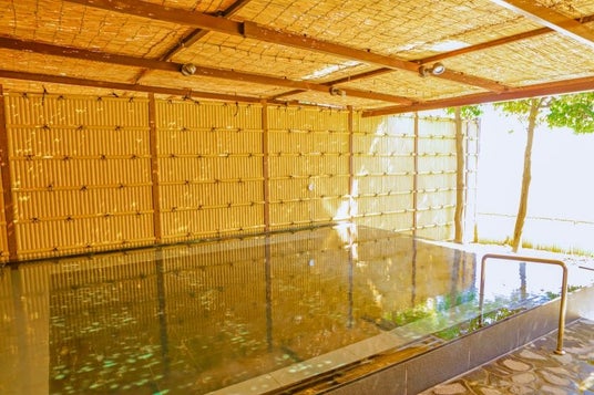 シックな色合いの浴槽とナチュラル素材の囲いが和風モダンの雰囲気を醸す「光彩の湯 露天風呂」。日中は窓から海を眺めることができます。