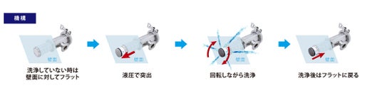 突出する機構により、洗浄時以外は配管内面に対してフラットな状態。そのためタンクやダクトに常設しておくことができる。